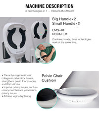 RF energy tightens overlying skin during the same session as muscle stimulation, combining two protocols into one.