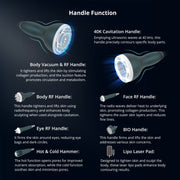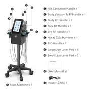 The device integrates 40K ultrasonic technology, multiple RF handles for body, face, and eye areas, vacuum RF functionality, LED laser pads, a BIO handle, and a hot and cold hammer. Each attachment is designed to support different contouring and skincare applications.