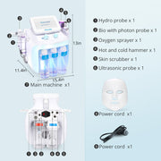 The package includes a hydrafacial handle, bipolar BIO photon, oxygen sprayer, hot and cold hammer, skin scrubber, ultrasonic probe, and LED mask, providing a wide range of facial treatment options.